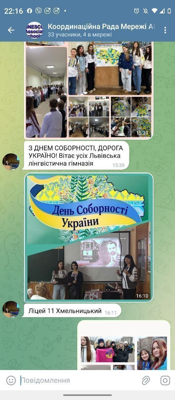 “Сьогодні український народ відзначає важливу дату своєї багатовікової історії – День Соборності України…. Живий ланцюг – символ єднання української нації!” (Гімназія “Діалог” м. Київ).