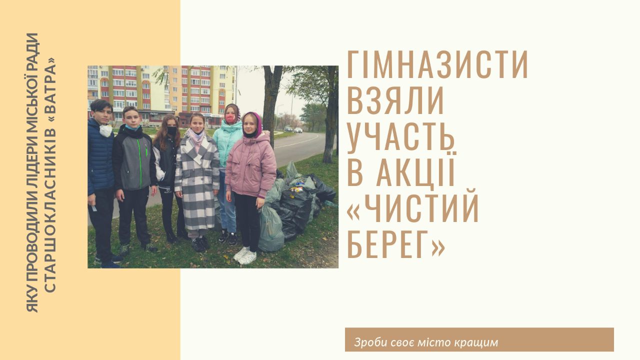 У Всесвітній день доброти, який відзначають 13 листопада гімназисти взяли участь в акції «Чистий берег» під гаслом «Зроби своє місто кращим», яку проводили лідери міської ради старшокласників «Ватра».