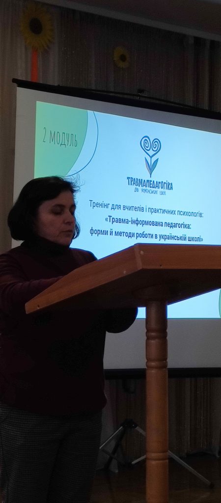 З ознаками стресу та психологічної травми, їх проявами у дітей різного віку та дорослих, особливостями надання першої допомоги познайомила Бутрим Лідія, учасниця проєкту Травмапедагогіка для українських шкіл під час чергової зустрічі з педагогами ліцею.